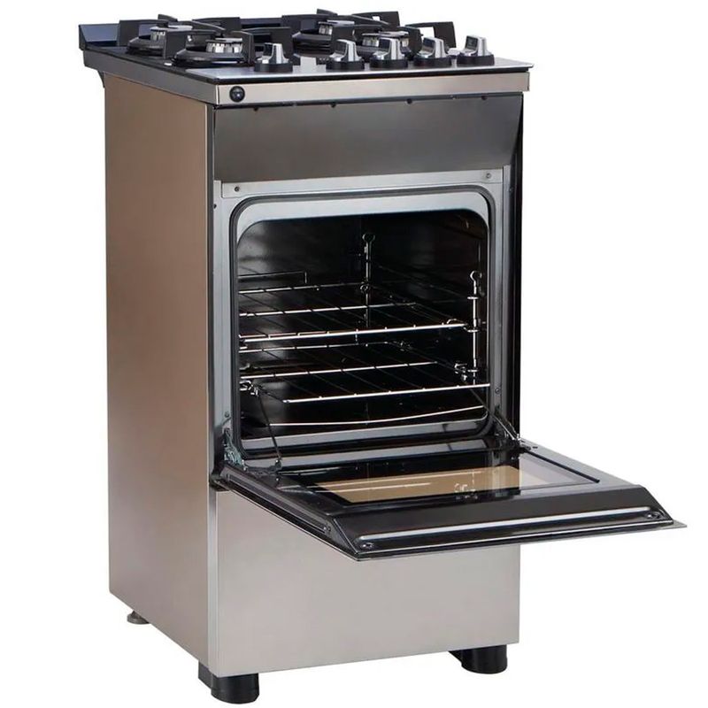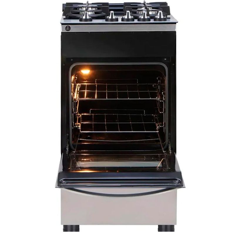 Su diseño es con mesada de vidrio templado y rejillas de hierro fundido. La puerta del horno, de vidrio templado, tiene una amplia visión interna para favorecer el acompañamiento de las preparaciones durante el proceso. Posee 2 rejillas dentro del horno, una movible y otra auto-deslizante, que facilita el retirado de los alimentos o preparaciones, ambas de fácil limpieza. Cuenta con grill eléctrico que permite gratinar y dorar las preparaciones, además, posee encendido electrónico y luz interior.