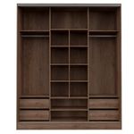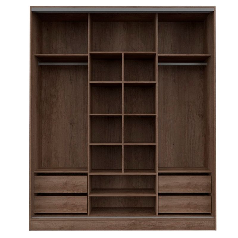 4 cajones con correderas metálicas, 2 espacios de colgado con barral de alumino, 8 divisorios en la parte central y 3 estantes en la parte superior.